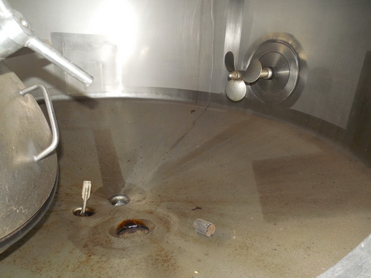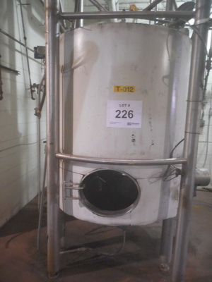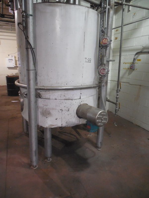 Approximately 1250 gallon Stainless Steel Tank. 60″ Dia. X 58″ Straight Side w/ Approx. 15 Degree Conical Bottom, w/ Center Drain, Lower Cleanout Port, Agitation Motor & Auger w/ Associated Pressure Relief Valve