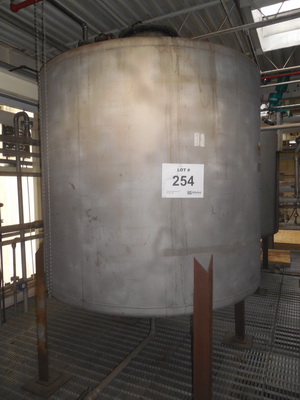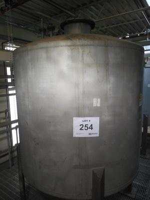 Approximately 1350 Gallon Stainless Steel Tank. 80″ Dia. X 65″ Straight Side w/ Concave Bottom, Drain, Convex Top, Associated Ports, Steel Legs.