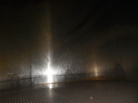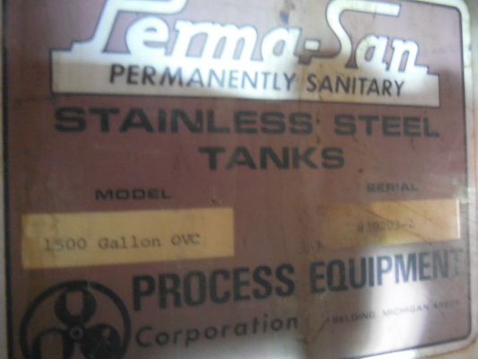 Approximately 1,500-Gallon Process Equipment Corp Permasan Permanently Sanitary CVC Stainless Steel Tank. 66″ Dia. 102″ Straight Side w/ Concave Bottom, Insertion Screen, Bottom Side Material Loadout Door, Associated Stand.