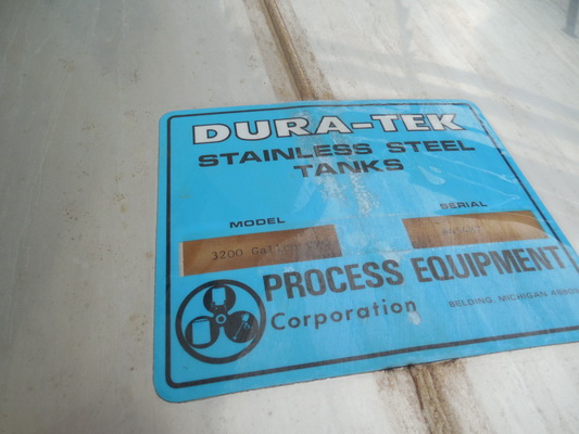 Approximately 3,200-Gallon Process Equipment Corp Dura-Tek Stainless Steel Tank w/ Iron Legs, Approx. 15 Degree Conical Bottom w/ Center Drain & Flat Top