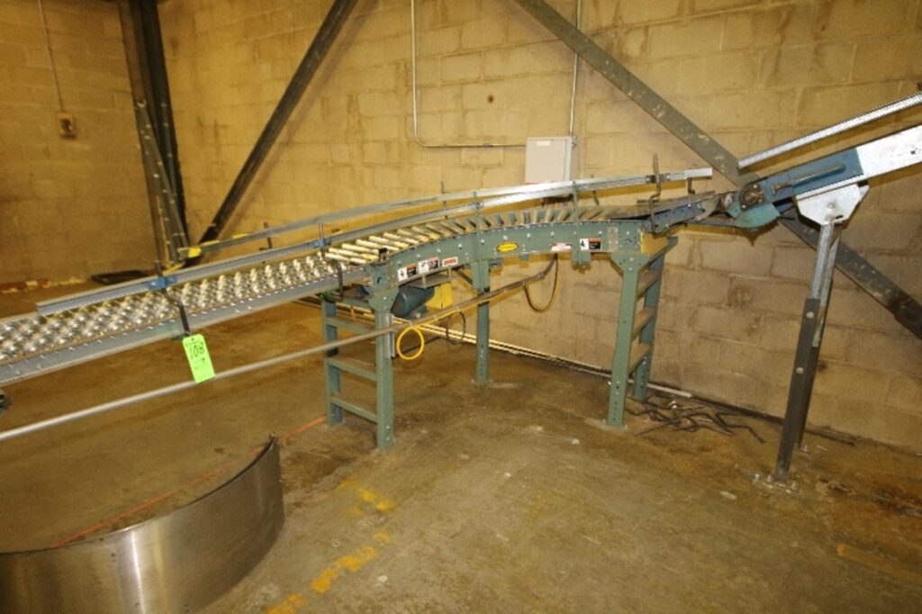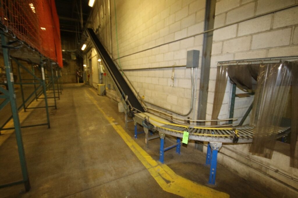 Aprox. 250′ Box Conveyor System, with Power Belt and Roller Conveyor, Straight and Incline Sections, Hytrol Curve Section