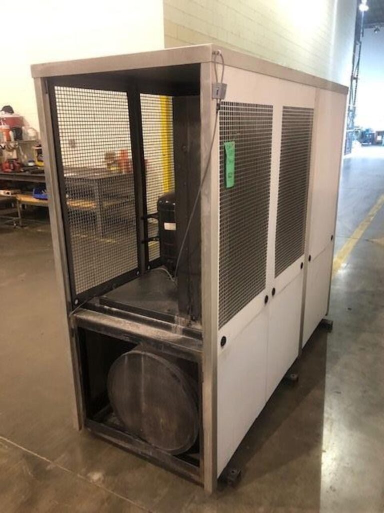 Air Cooled Self Contained Condneser, Weatherproof design for Outdoor Installation, with a 5 hp Compressor 1/2 hp pump fans 1/2 hp, Test Pressures High 300 Low 150, 3 phase 60Hz, High ambient to 110 degrees F, Turbine pump, Auto switchover to city water (includes low flow and high temperature interlock with dry contact input), Heat exchanger/gradient pump cabinet includes split loop piping connections and gauges, Linebacker phase loss protection, BTU/HR is 41,785,Cooling discharge temp is 56 degrees F, Thermostat adjustable range is 40 to 90 degrees F, Voltage 208/60/3